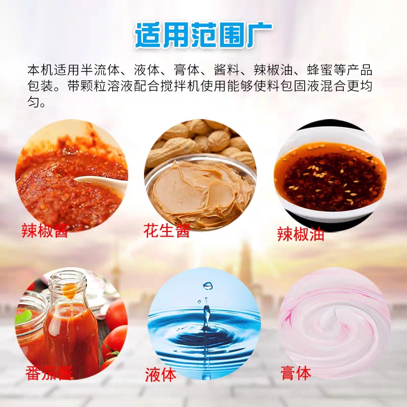 5、膏體灌裝機(jī)針對(duì)醫(yī)藥(婦科用藥,皮炎平,紅霉素軟膏,防凍霜等)、日化(牙膏,鞋油,潤(rùn)膚霜,化妝品等)、食品(芝麻醬,甜面醬,番茄醬,奶油等)、化工(玻璃膠、密封膠、白乳膠等)、潤(rùn)滑油及特殊行業(yè)的膏體灌裝
